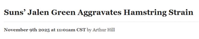 北京时间11月10日,据太阳队记兰金报道,太阳队担心杰伦-格林可能会缺席多场比赛,他在周日战胜快船队的比赛中加重了右腿筋拉伤。